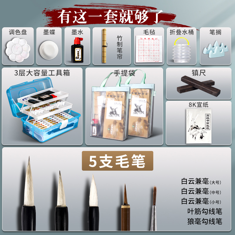 六品堂国画颜料初学者套装12色24色中国画用品工具全套水墨画入门高级工笔画材料小学生儿童毛笔国画正品全套