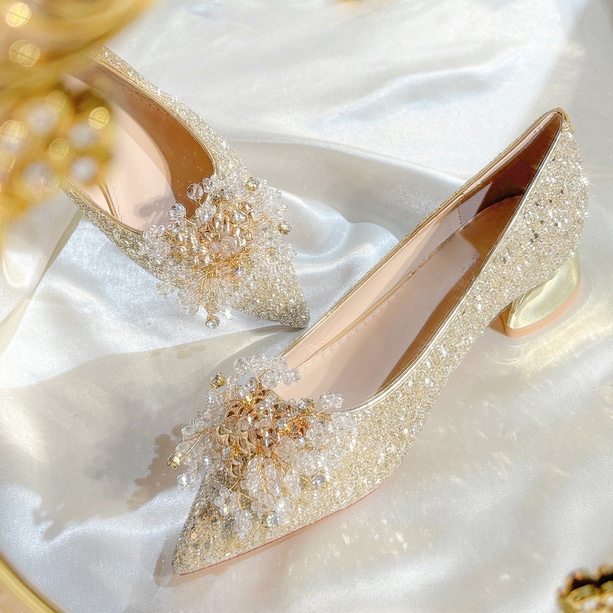 婚鞋女2024年新款主婚纱新娘鞋亮片香槟色水晶鞋尖头细跟高跟鞋女