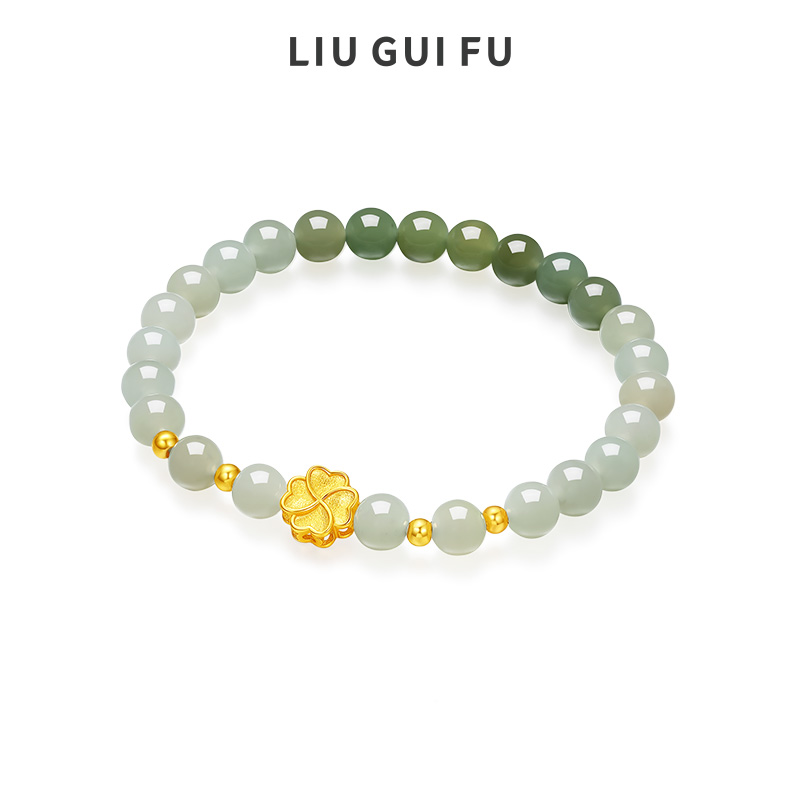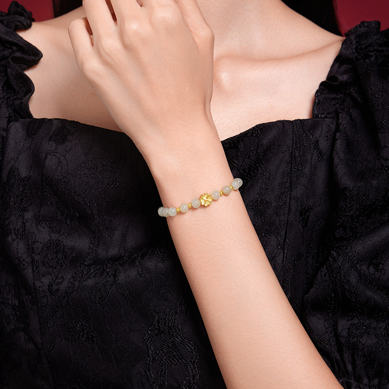 六桂福珠宝天然渐变和田玉手串S925银四叶草转运珠生日礼物送女友
