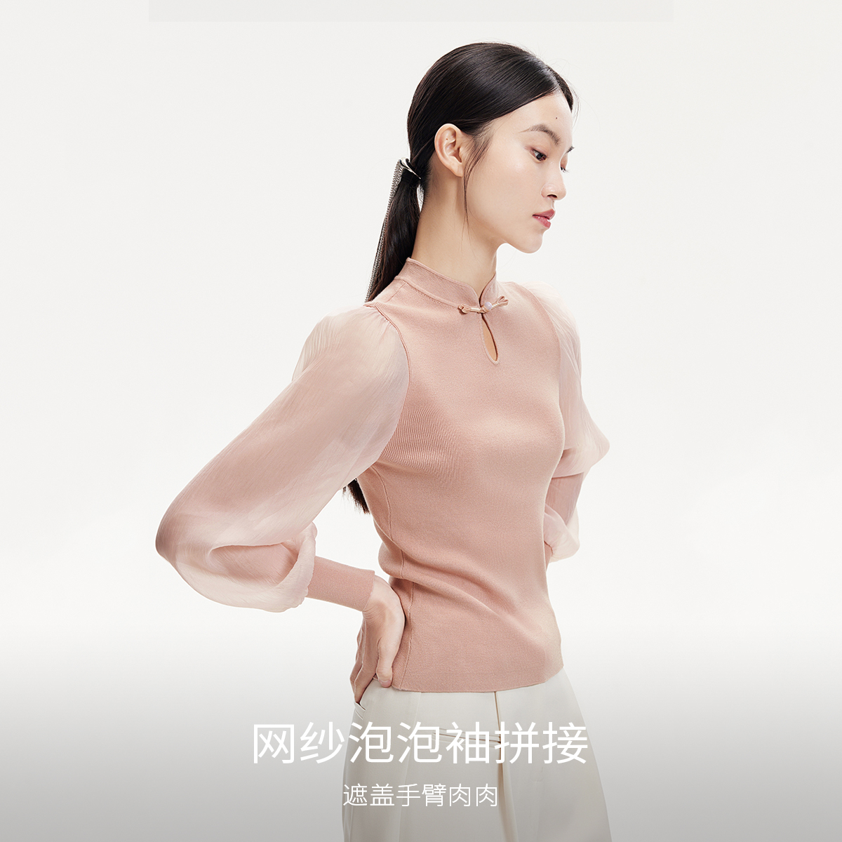 Vero Moda奥莱针织衫毛衣女秋冬新款中式盘扣针织拼纱泡泡袖上衣