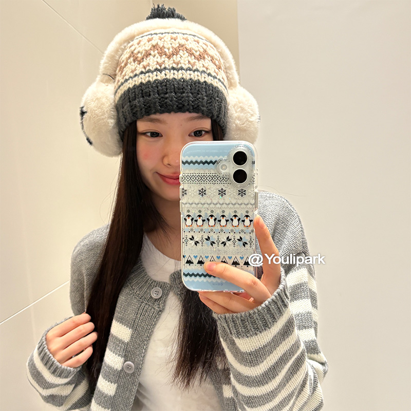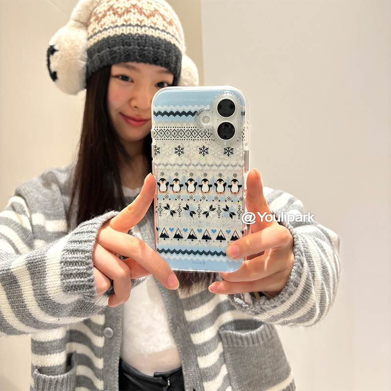 由里公园ins秋冬可爱费尔岛闪粉雪花小企鹅适用16pro苹果16ProMax手机壳iPhone16全包14新款14Promax保护套15