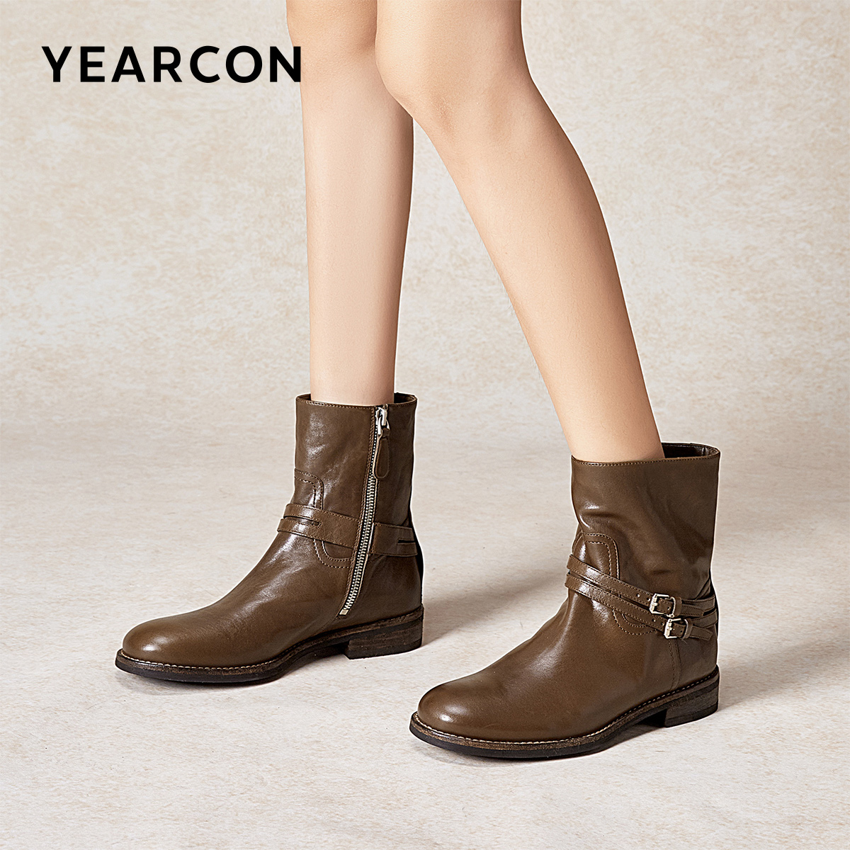 牛皮版~内增高复古短靴女2025秋冬西部马丁靴圆头短筒勃肯堆堆靴