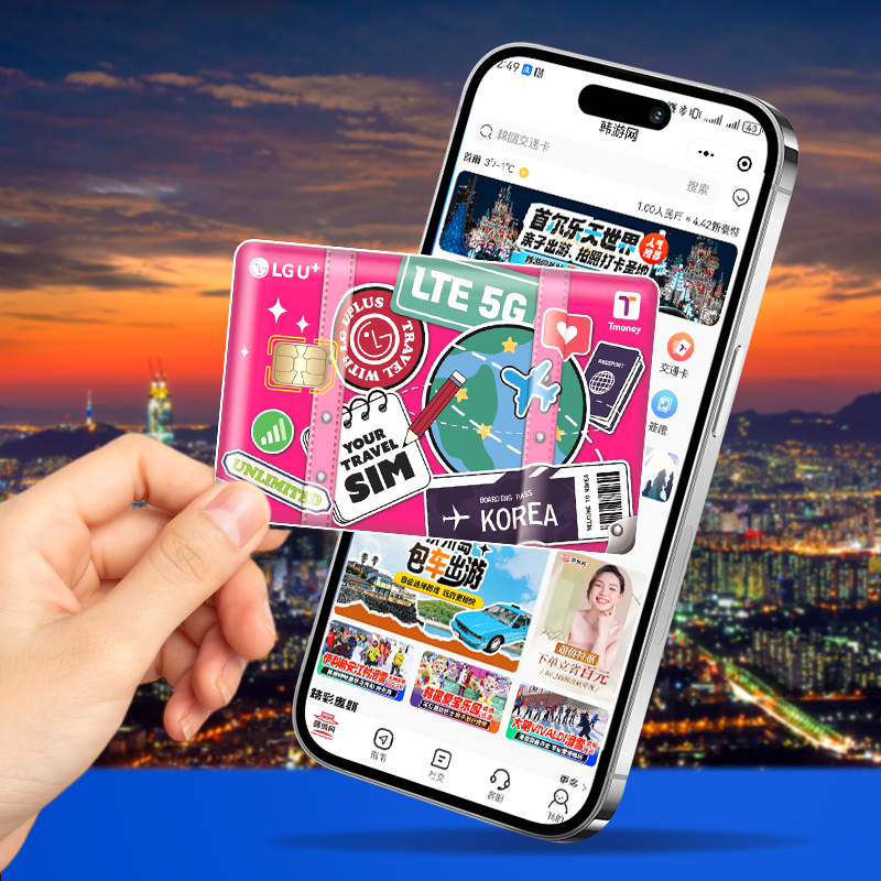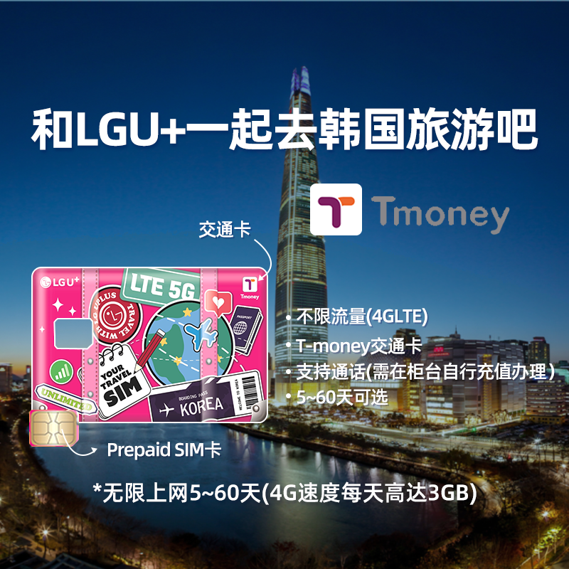 韩国机场自取LGU+电话卡含通话高速流量tmoney交通卡首尔插卡即用
