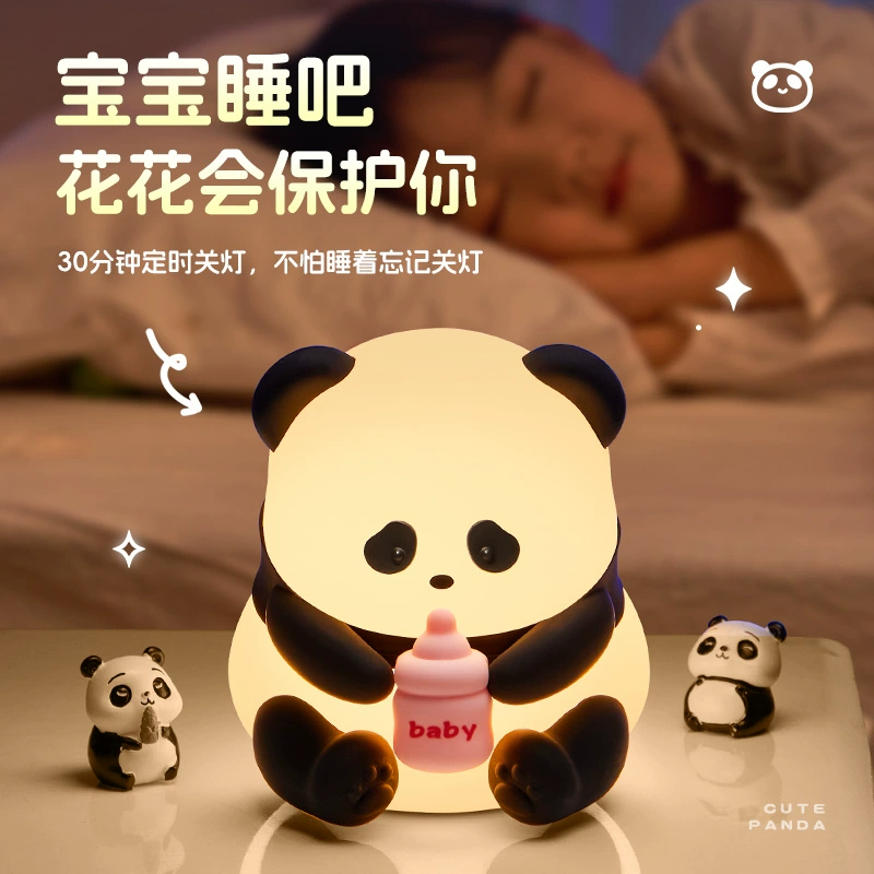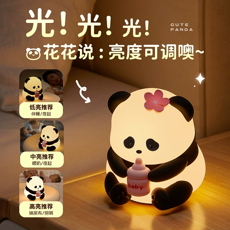 花花熊猫小夜灯儿童伴睡拍拍灯卧室床头睡眠氛围感硅胶拍拍台灯灯