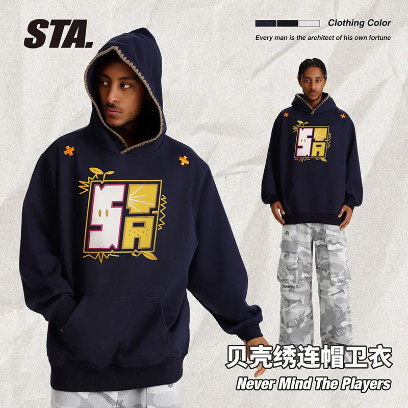 STA官方店贝壳刺绣民族风复古连帽卫衣男美式宽松秋冬套头外套潮
