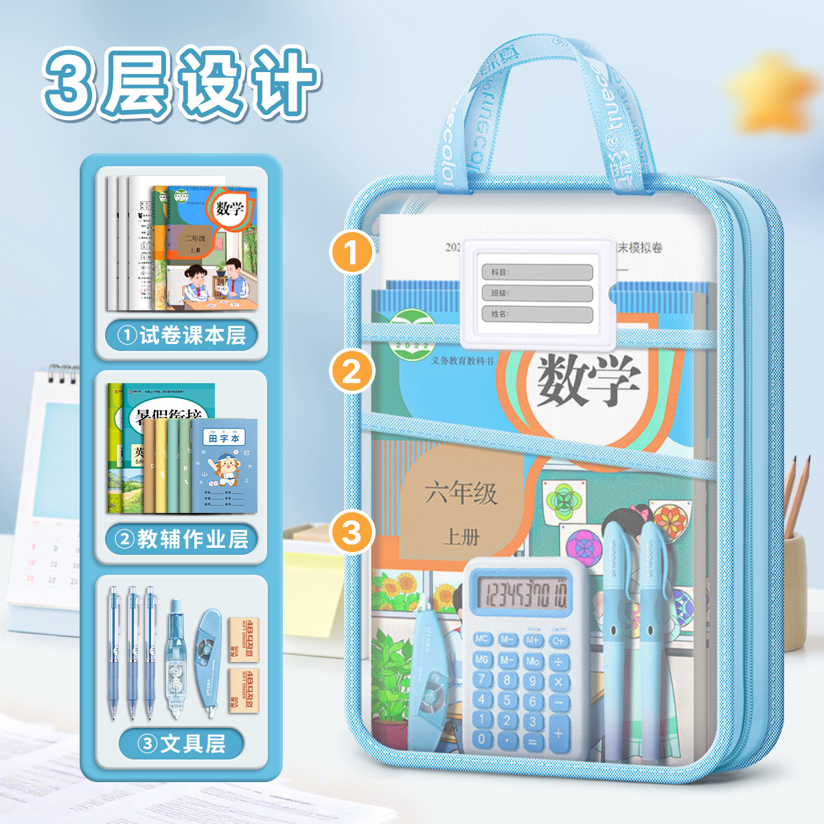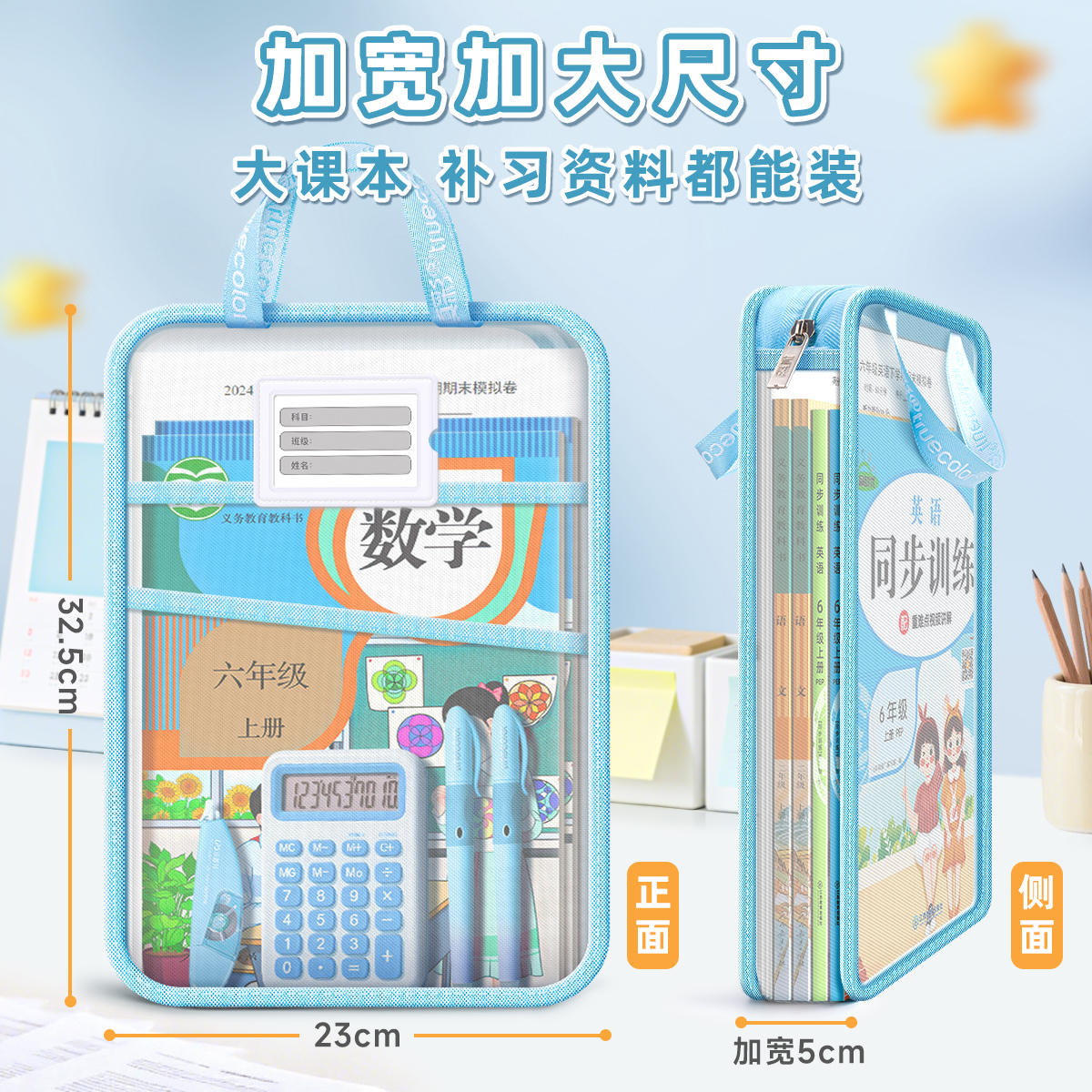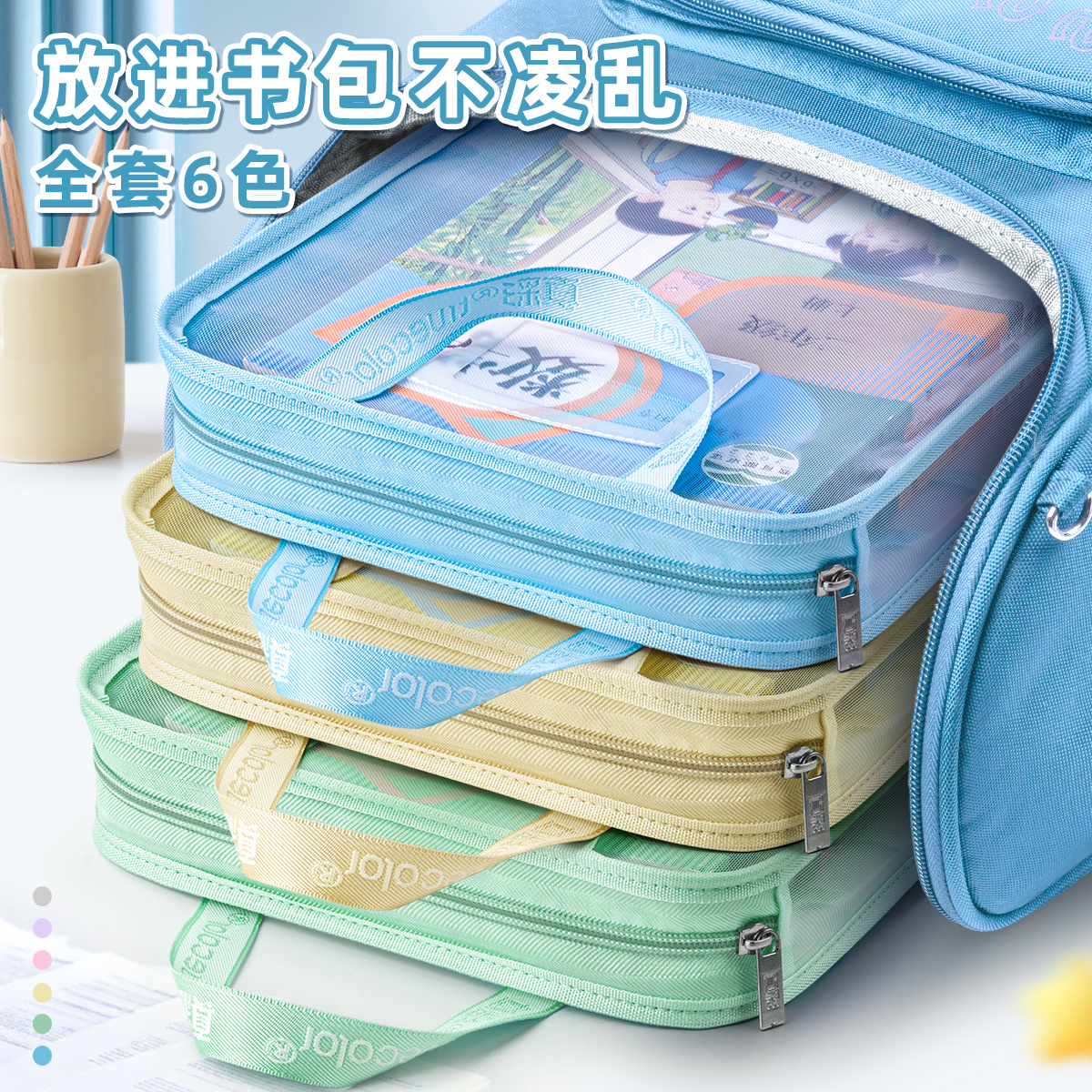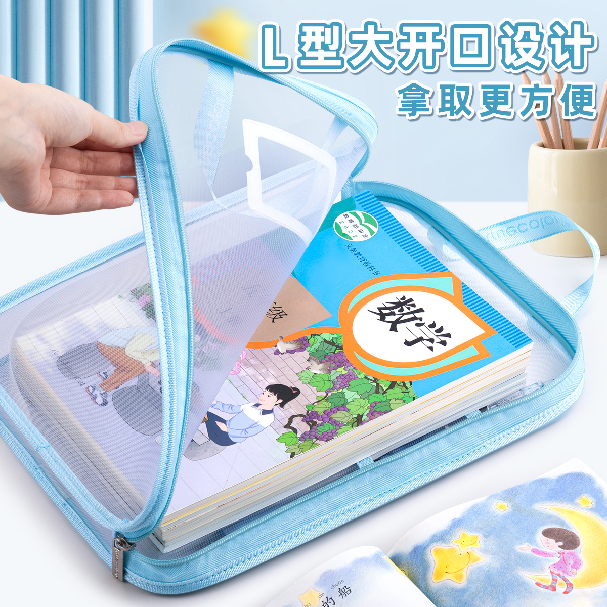 真彩L型科目分类袋透明文件袋拉链式小学生网纱大开口手提拎书袋专用袋子初中生作业补习袋档案袋试卷收纳袋