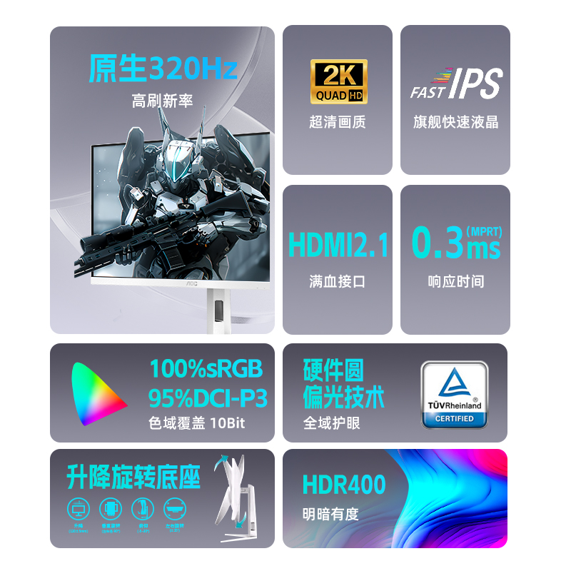 AOC圆偏振光27英寸2K300Hz显示器Q27G4SL/WS高刷白色台式电脑屏幕