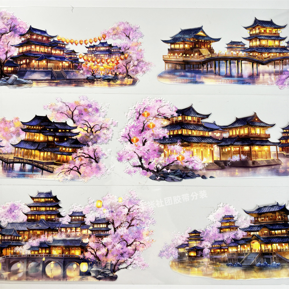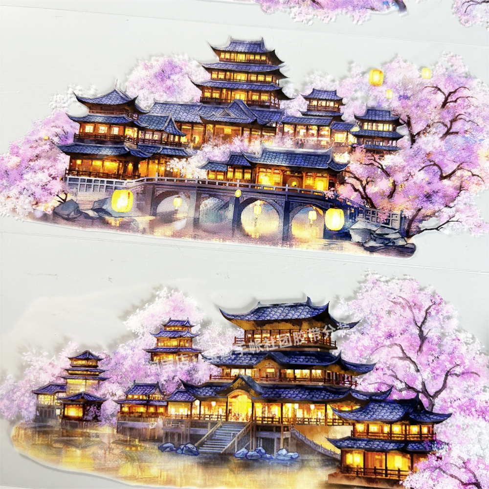 手帐分装胶带b051春江月夜zero桥房屋晚古风PET素材账流麻diy贴纸