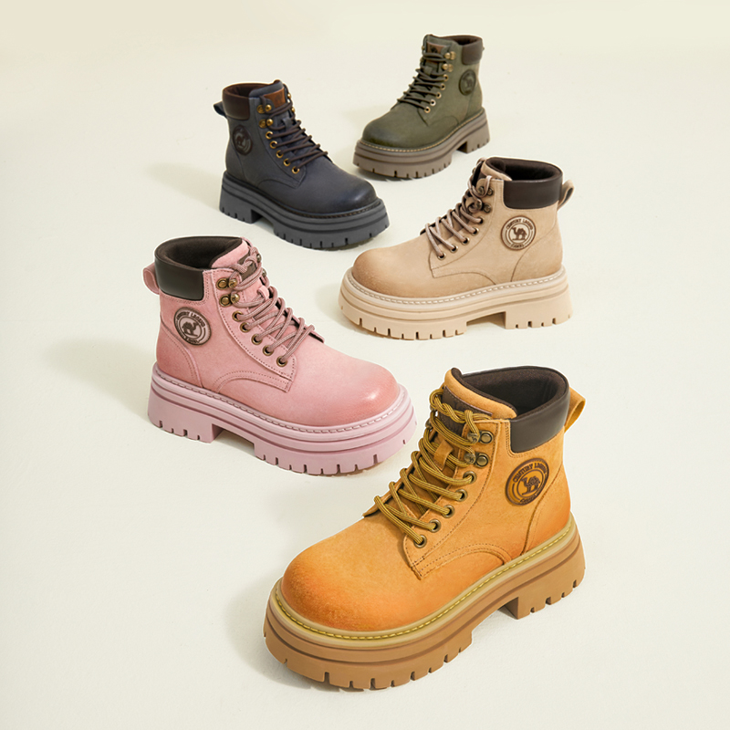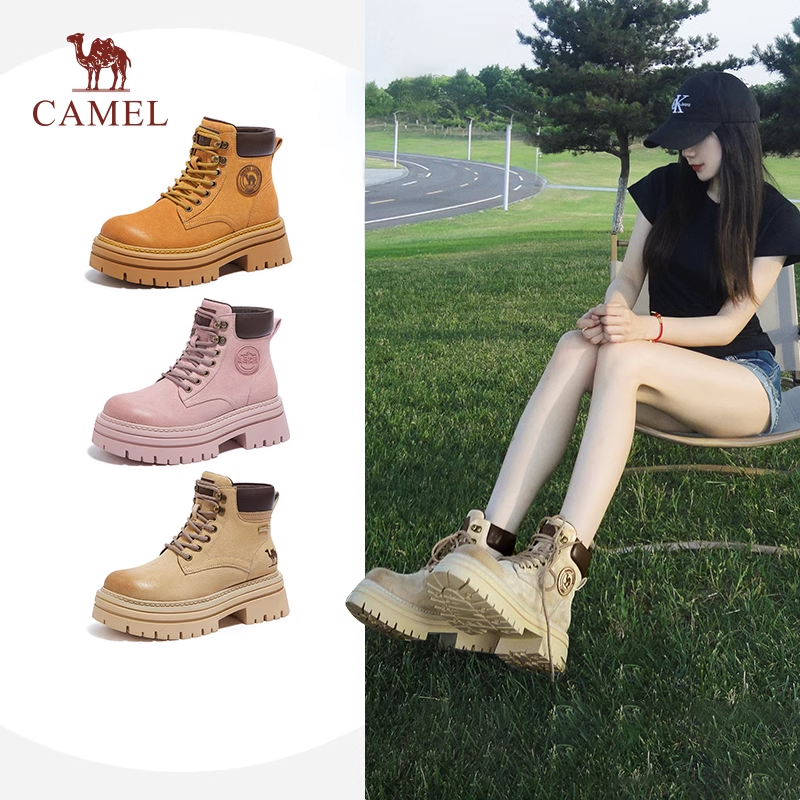 骆驼马丁靴女粉色2025秋百搭防滑工装靴户外登山鞋大黄靴