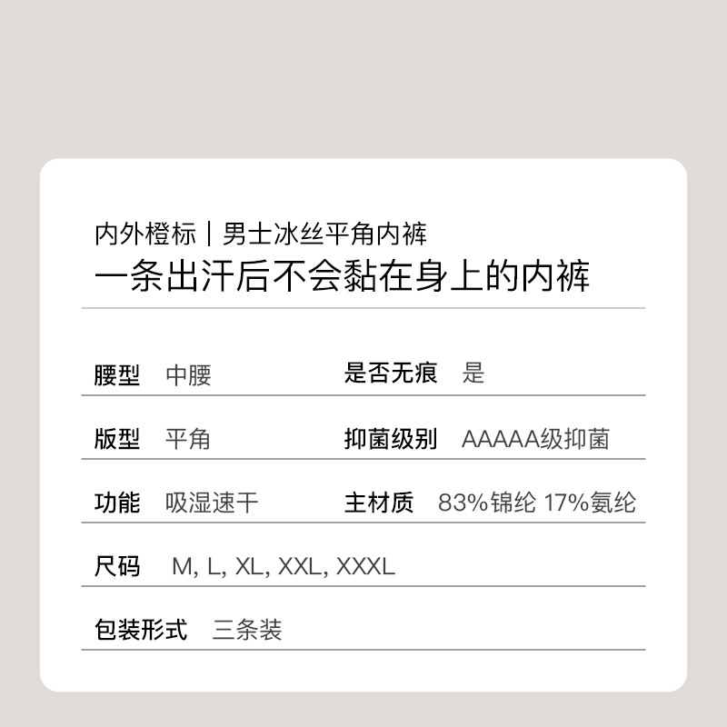 3件|内外橙标男士轻薄平角内裤透气舒适新品NEIWAI231MU1504