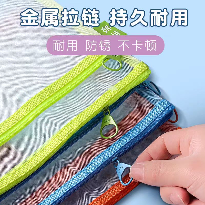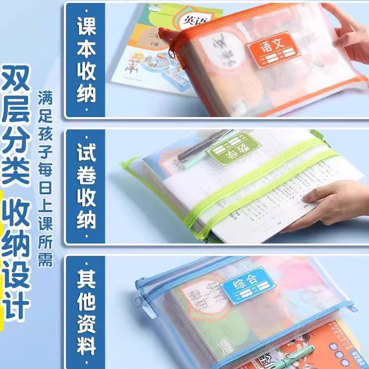 学科科目分类文件袋拉链式双层大容量小学生用资料书本课本分科书袋试卷收纳袋学生装卷子作业袋子A4透明网纱