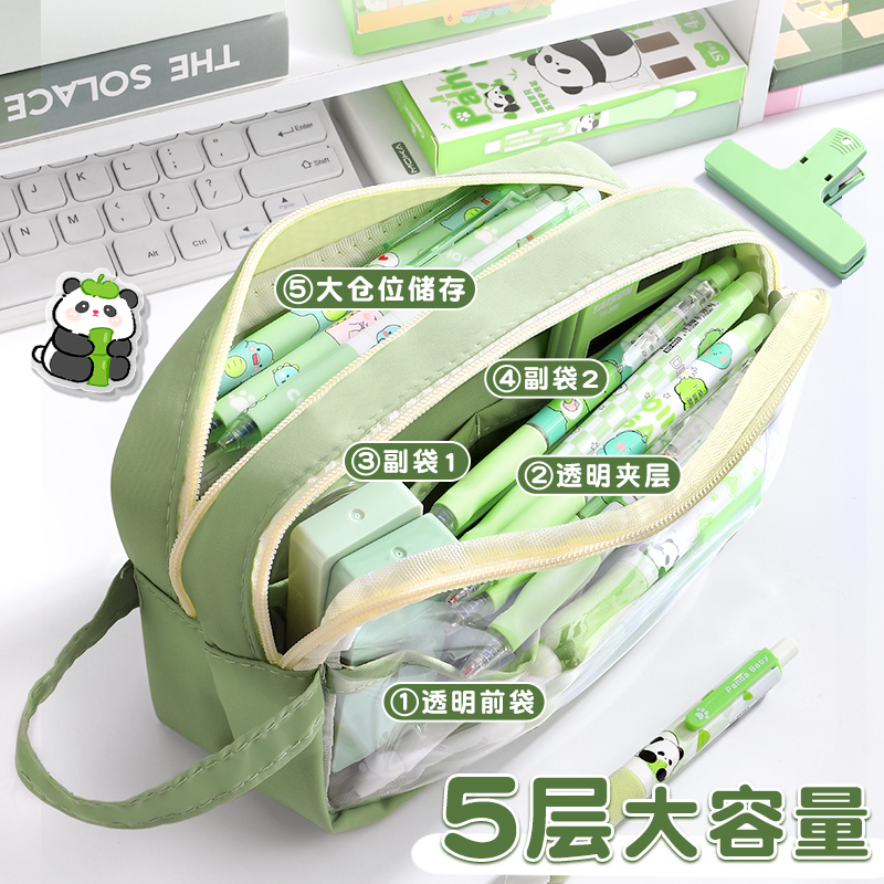 五层熊猫笔袋学生透明ins风大容量高颜值防水耐脏女孩文具盒初高中简约儿童多功能铅笔盒可手提便携收纳笔袋