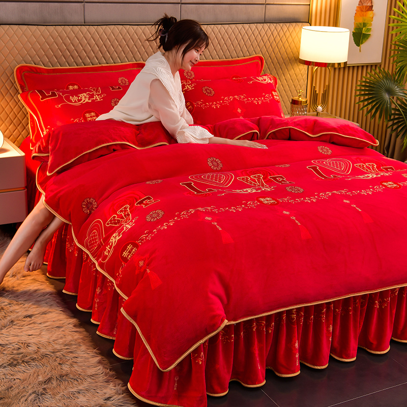 高档加厚牛奶绒四件套秋冬季床裙款双面绒被套纯色三件套床上用品