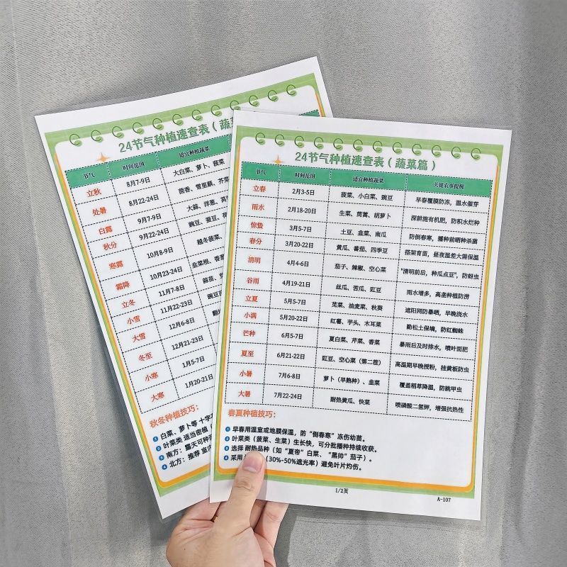 24节气种植速查表蔬菜篇+蔬菜种植时间表A4防水塑封挂图认知卡