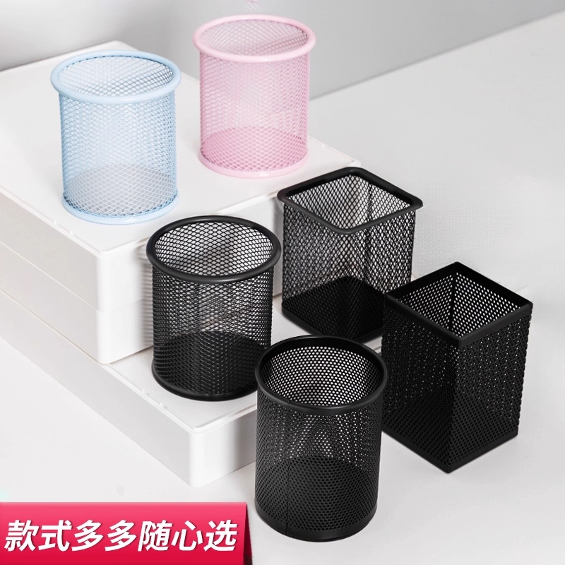 大容量黑色笔筒简约创意网纹圆形镂空多功能金属网格笔筒桌面办公书房笔插商务笔类时尚化妆刷收纳盒学生文具