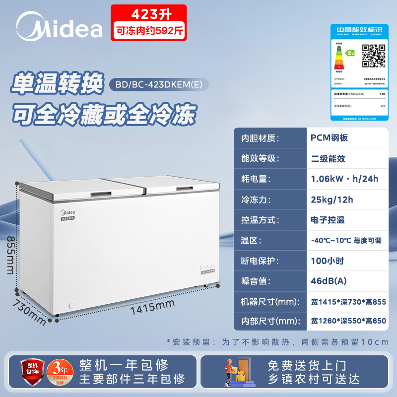 美的423升大容量冰柜家商用卧式冷柜节能冰箱冷藏保鲜冷冻柜囤货