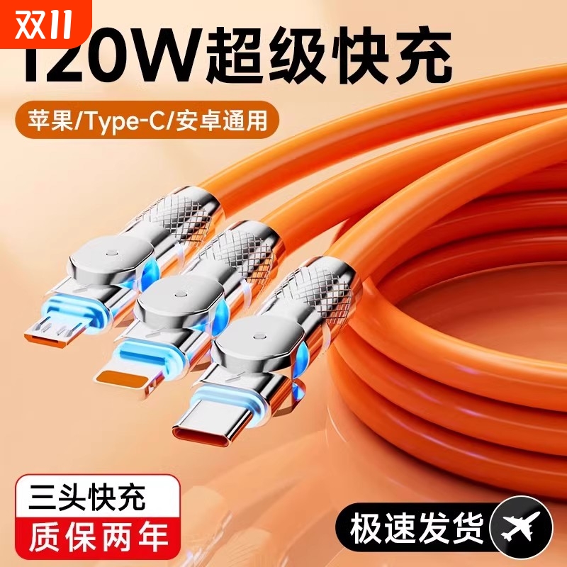 一拖三数据线120w机客线三合一安卓手机充电线快充适用苹果华为typec超级插头车载多功能充电器线接口收纳