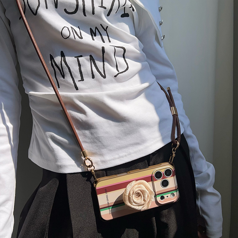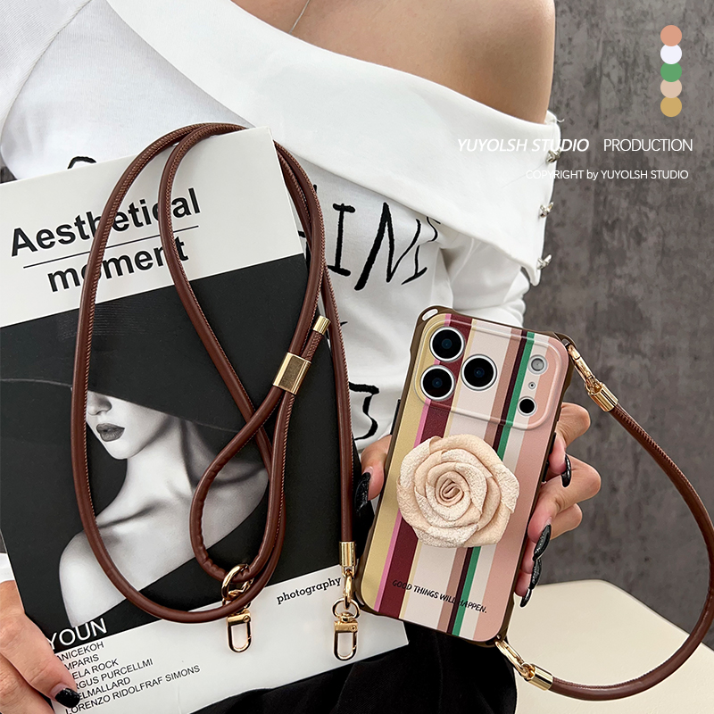 【卡布玫瑰】原创调节挂绳斜挎适用于苹果17Pro手机壳老钱风条纹小米15Pro支架华为pura80背带斜跨mate70链条