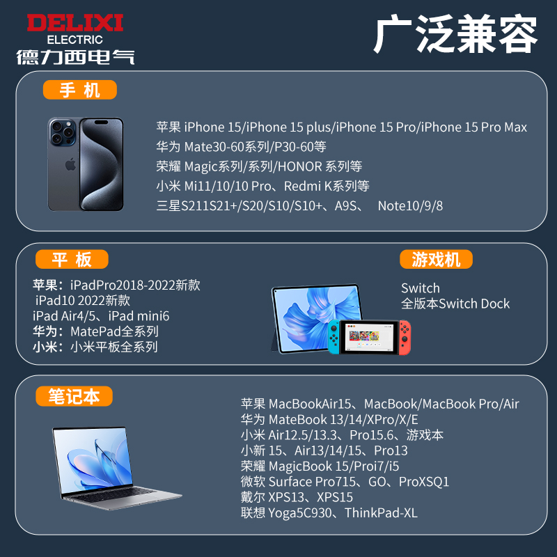 德力西PD60W超级快充数据线适用于华为苹果小米oppovivo荣耀安卓type-c充电线手机车载多头冲电闪充充电器