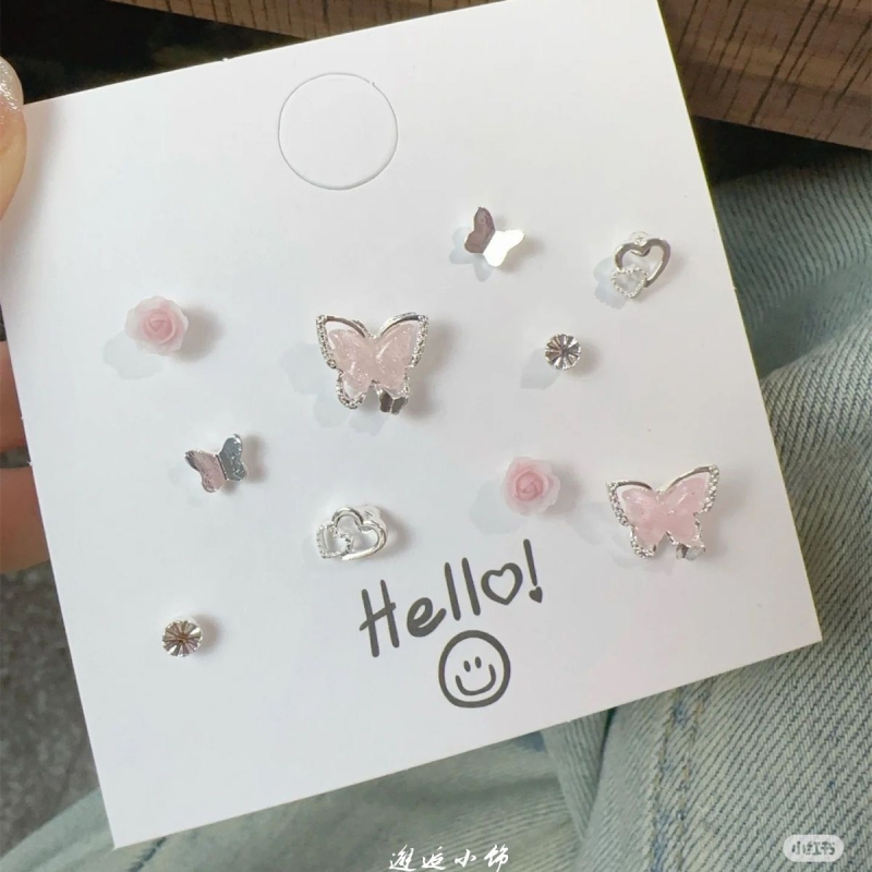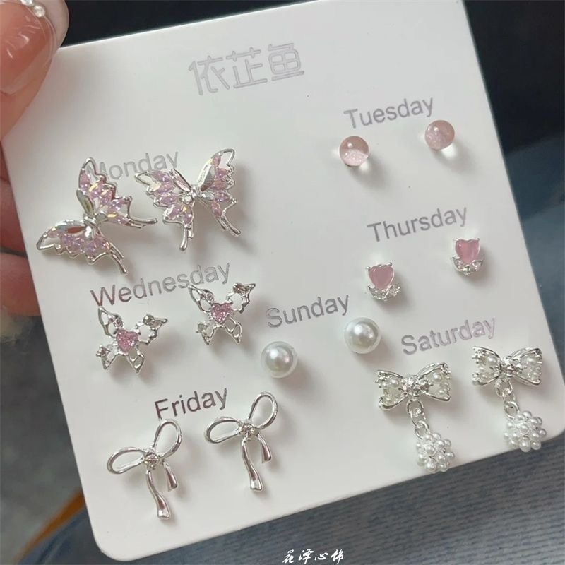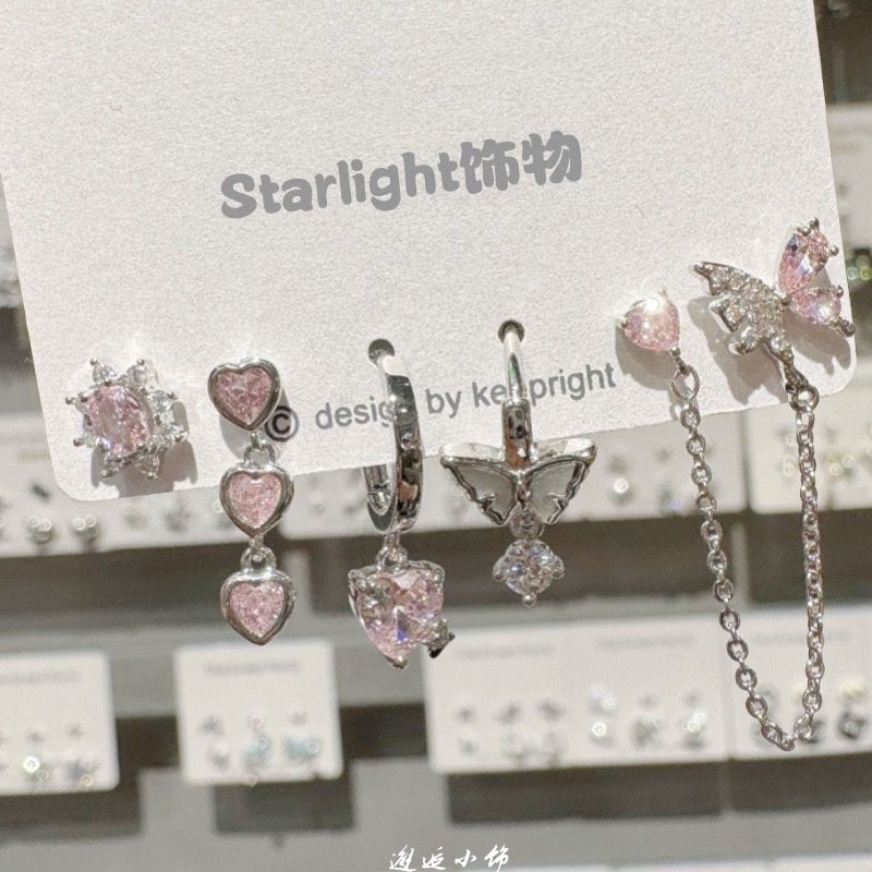 早春粉色耳钉温柔镶钻蝴蝶结套装小众设计感耳饰流苏锆石啊粉嫩系