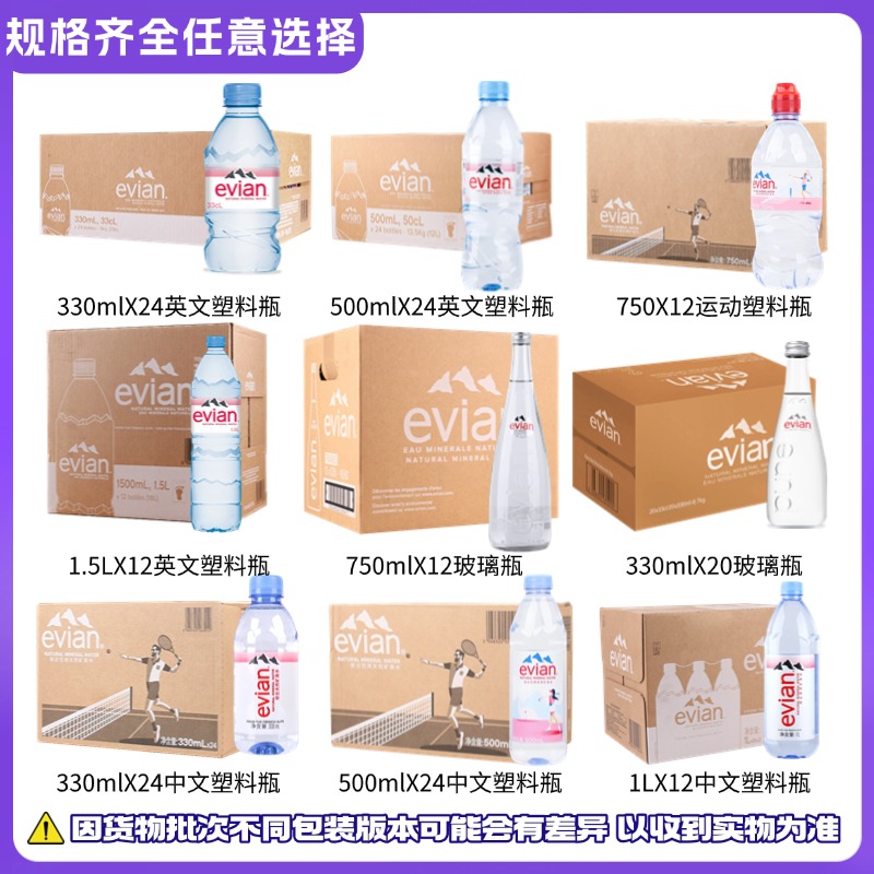 evian依云法国进口天然弱碱性含锶矿泉水330ml/500ml*24瓶/箱纯净