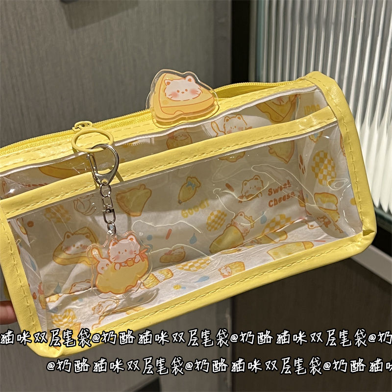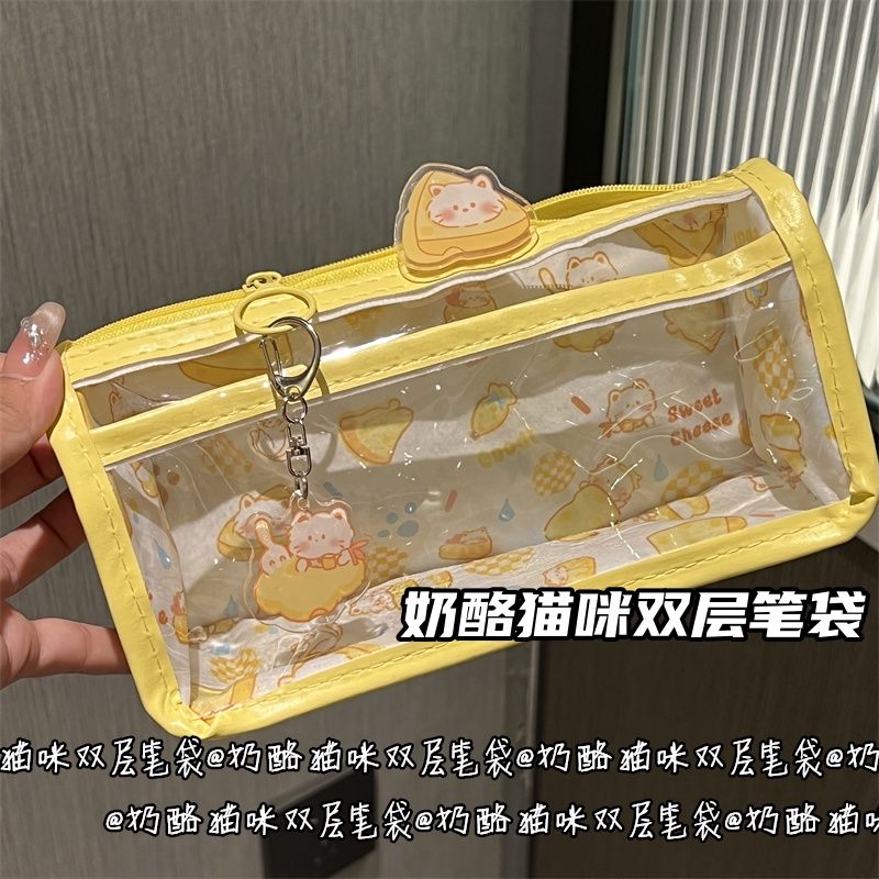 猫咪奶酪笔袋双层三角形透明笔袋ins高颜值学生可爱文具盒大容量笔盒少女心文具袋笔夹考试学习作业专用爆款