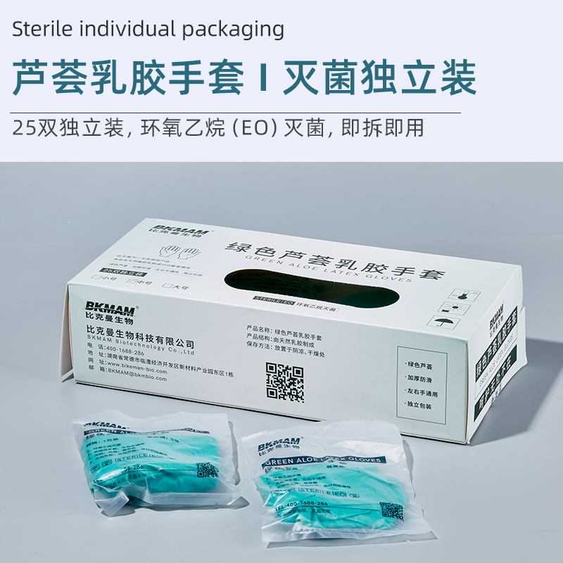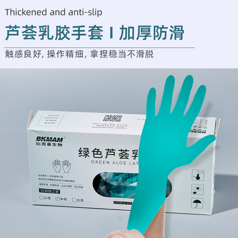 比克曼生物一次性乳胶手套实验室科研专用耐酸碱绿色芦荟橡胶手套高弹服帖无菌独立装食品环保