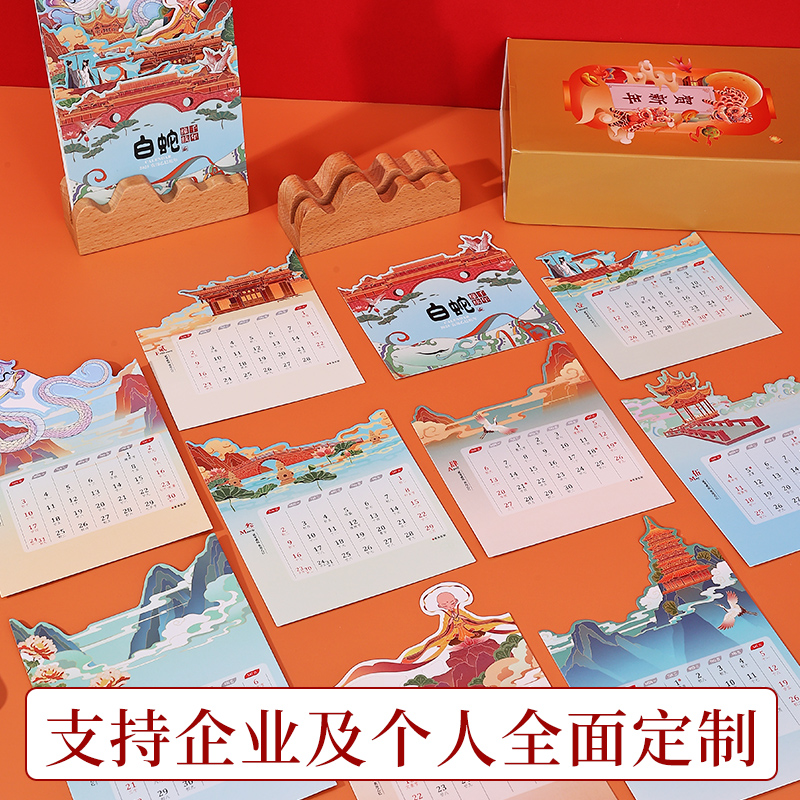台历2026年白蛇缘续千年历桌面日历摆件创意异形插卡定制古风订做logo办公桌打卡木质底座定制国风月历