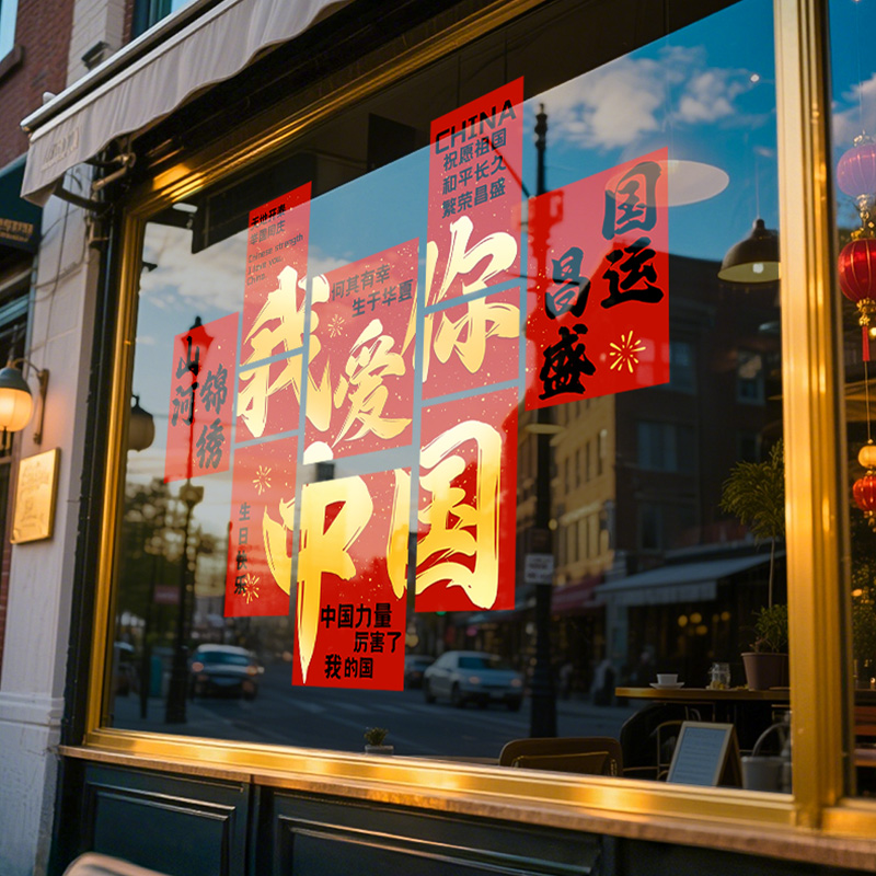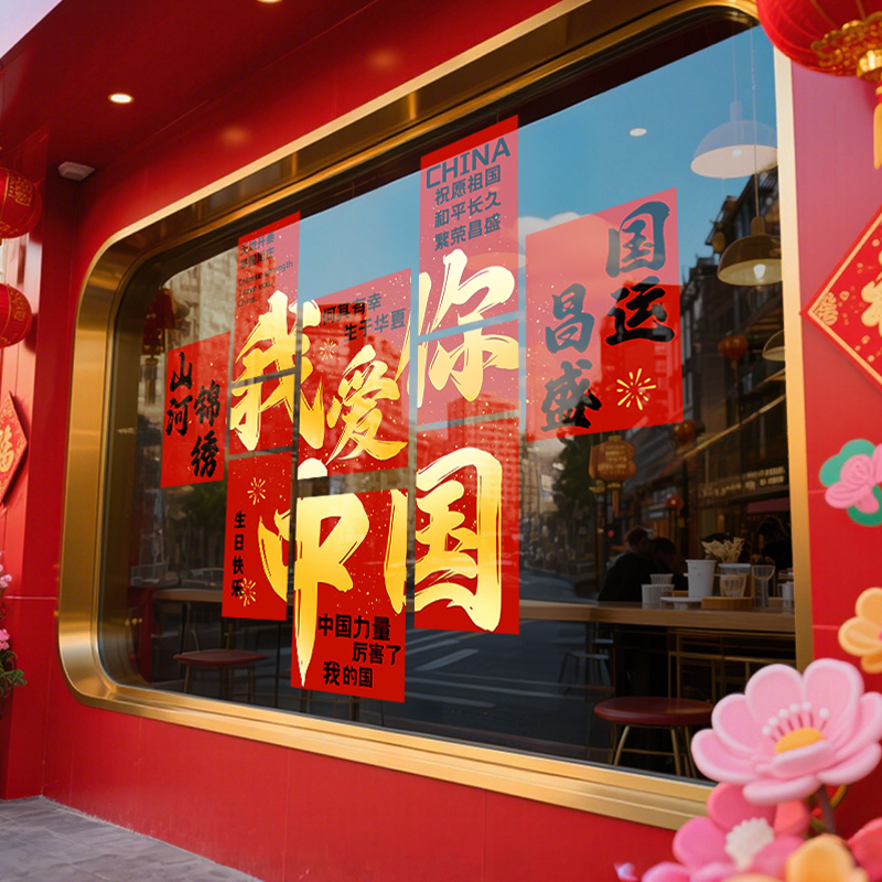 国庆节装饰品橱窗氛围场景布置静电窗花贴商场玻璃门贴纸立体祖国