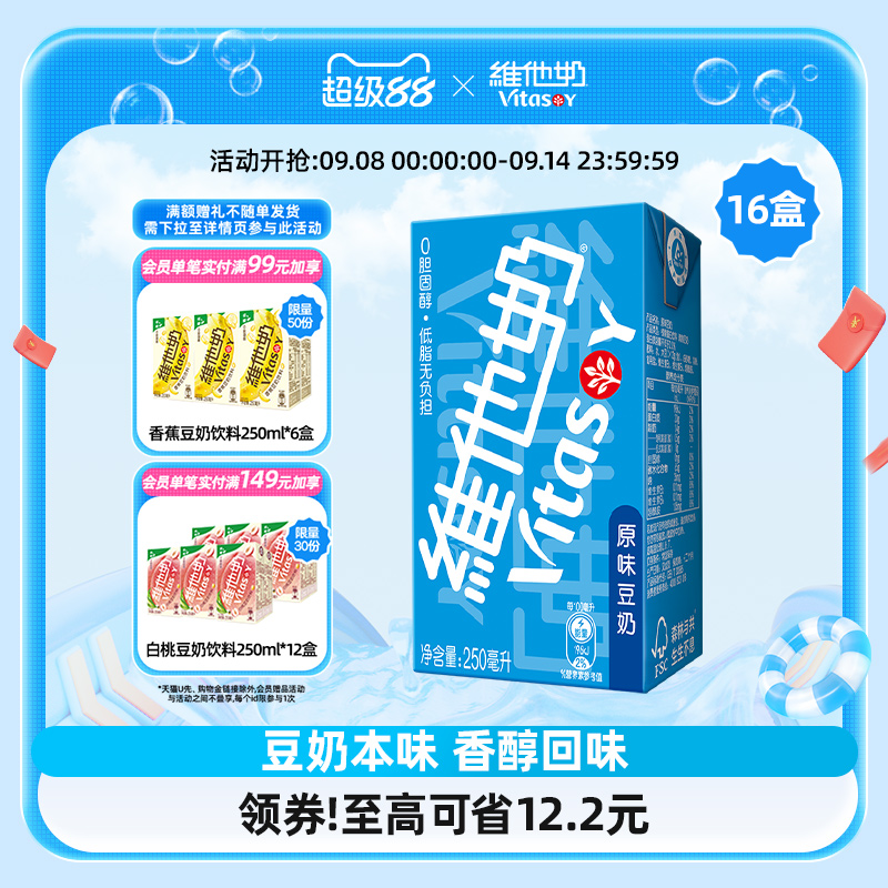 vitasoy维他奶原味豆奶植物蛋白饮料奶饮品250ml*16盒整箱早餐奶