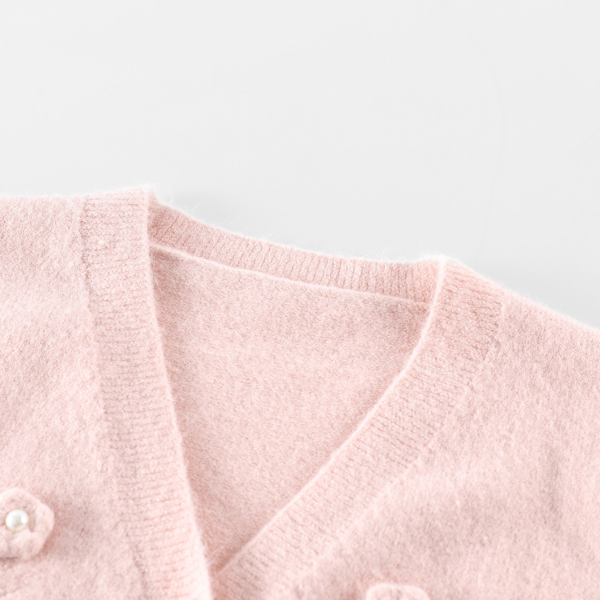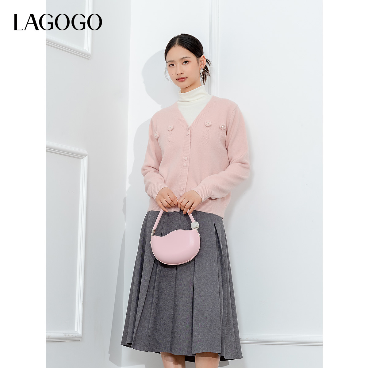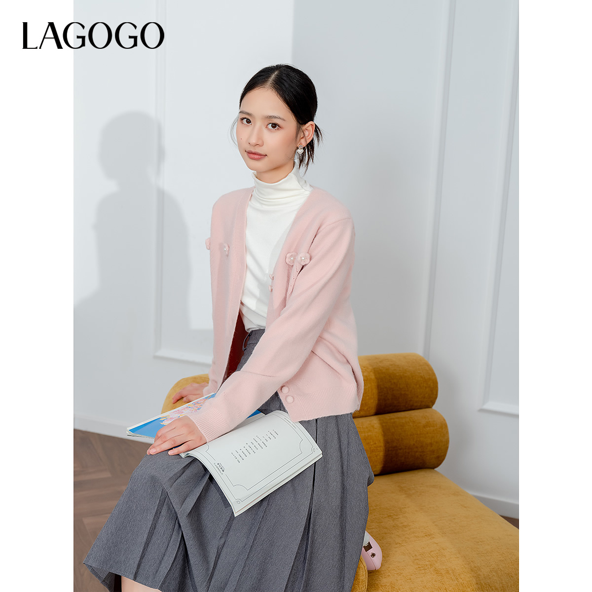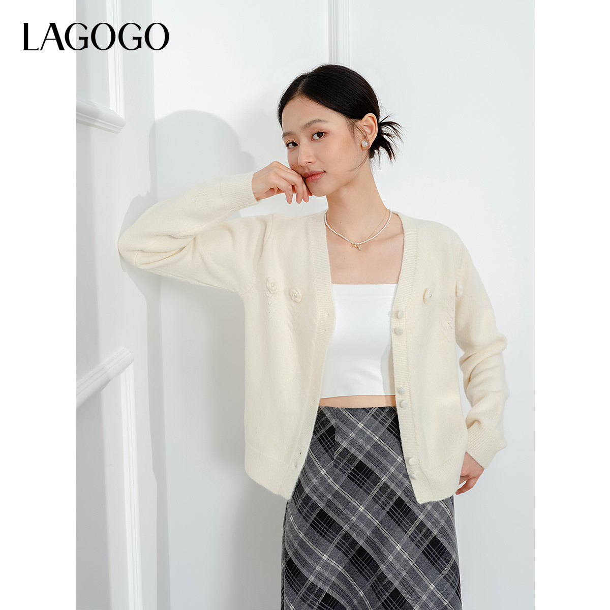 LAGOGO温柔立体花朵优雅毛针织衫女拉谷谷春秋新款女显瘦V领开衫