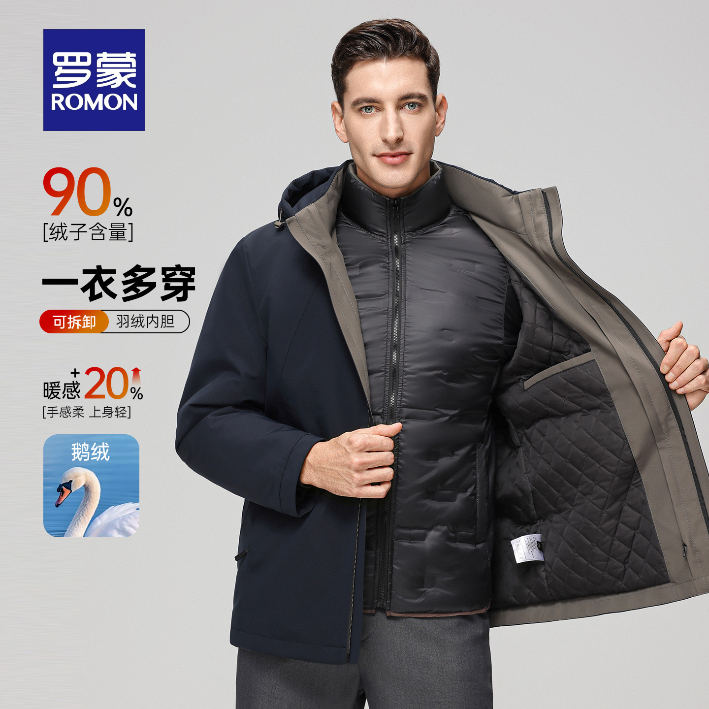 【鹅绒一衣五穿】罗蒙男士保暖短款羽绒服2025冬新款可拆内胆外套