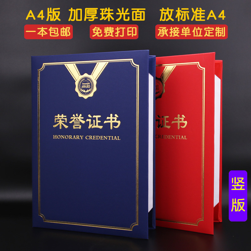 A4横版竖版红色蓝色荣誉证书珠光封皮面外壳12k8k颁奖获奖状公司企业大学生教师定制定做打印制作优秀员工证