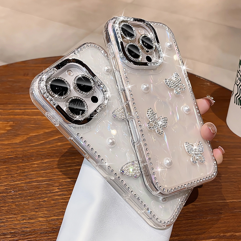 适用苹果16promax手机壳iphone15新款水钻镜头膜14pm珍珠蝴蝶贝壳纹13气囊防摔12相机按键全包高级好看外壳女