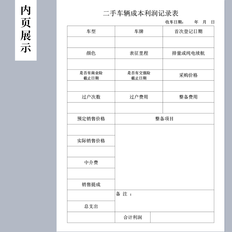 新款二手车辆成本利润记录表报表记账本贩子二手车商登记本车辆情况明细表车况登记车辆定制