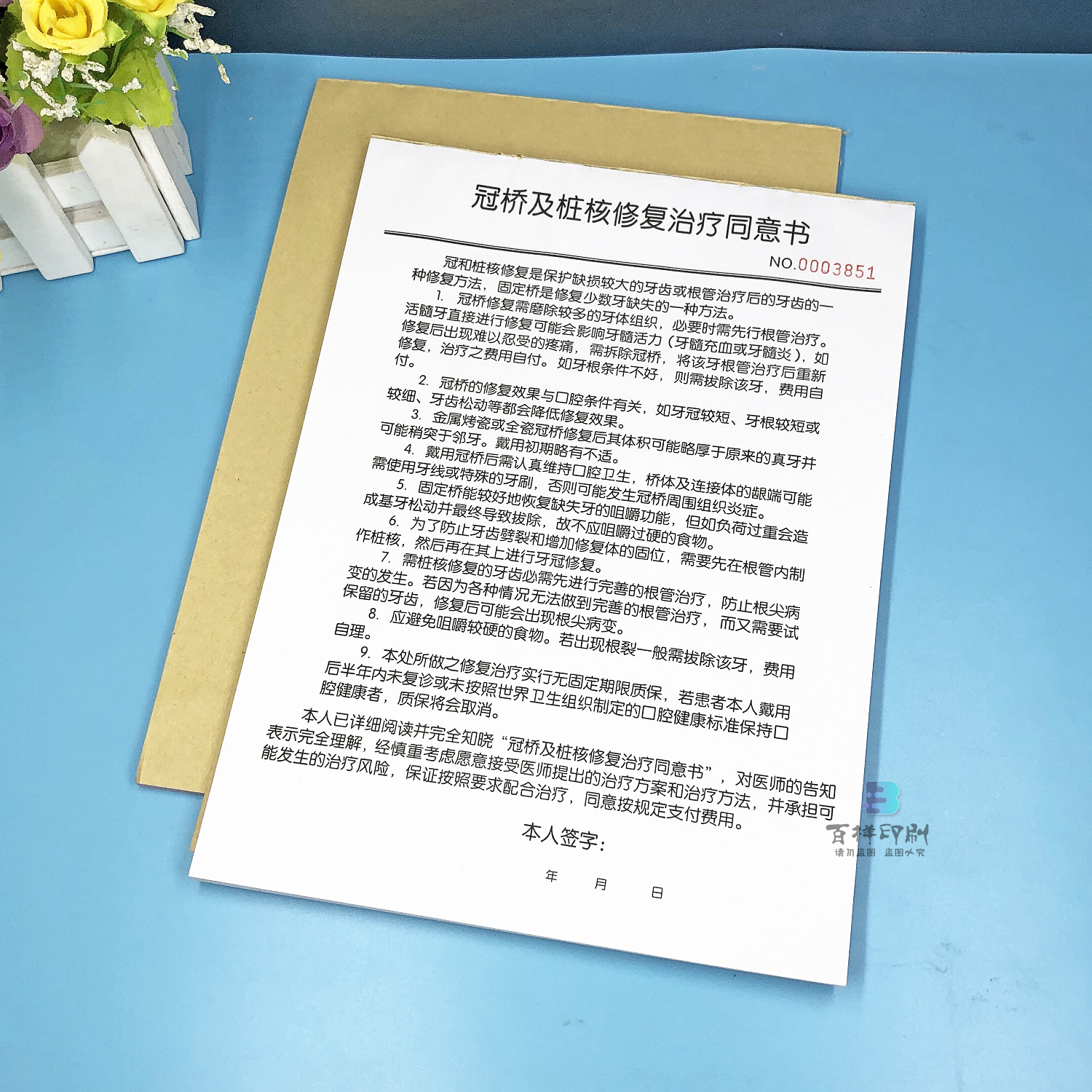 口腔医院冠桥及桩核修复知情同意书单联牙科门诊所治疗确认单定制