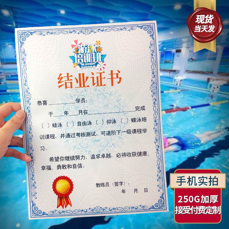 现货加厚游泳奖状培训班荣誉证书内芯舞蹈健身武术跆拳道优秀学员结业证书打印家长感谢信奖状纸定制通用加急