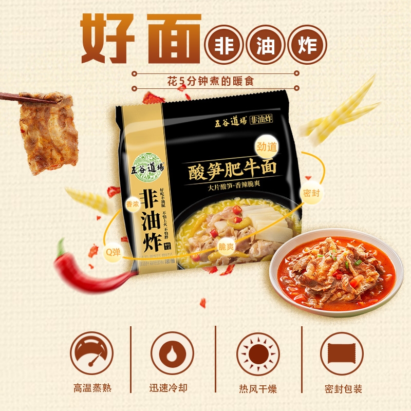 五谷道场非油炸方便面酸笋肥牛番茄牛腩红烧牛肉泡面袋装整箱批发