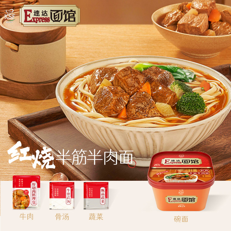 康师傅速达面馆半筋半肉红烧牛肉面方便面碗装泡面非油炸面整箱