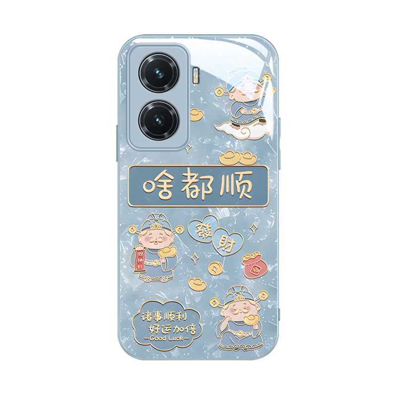 适用vivoY77手机壳玻璃V2219A啥都顺vivoy77e保护套V2166BA全包边vlvoy775g防摔viv0丫新年款财神喜庆高级女