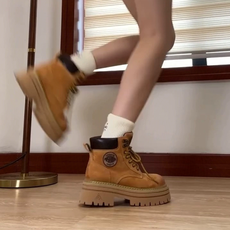 厚底内增高马丁靴女英伦风2025秋冬新款透气真皮大黄靴粉色高跟