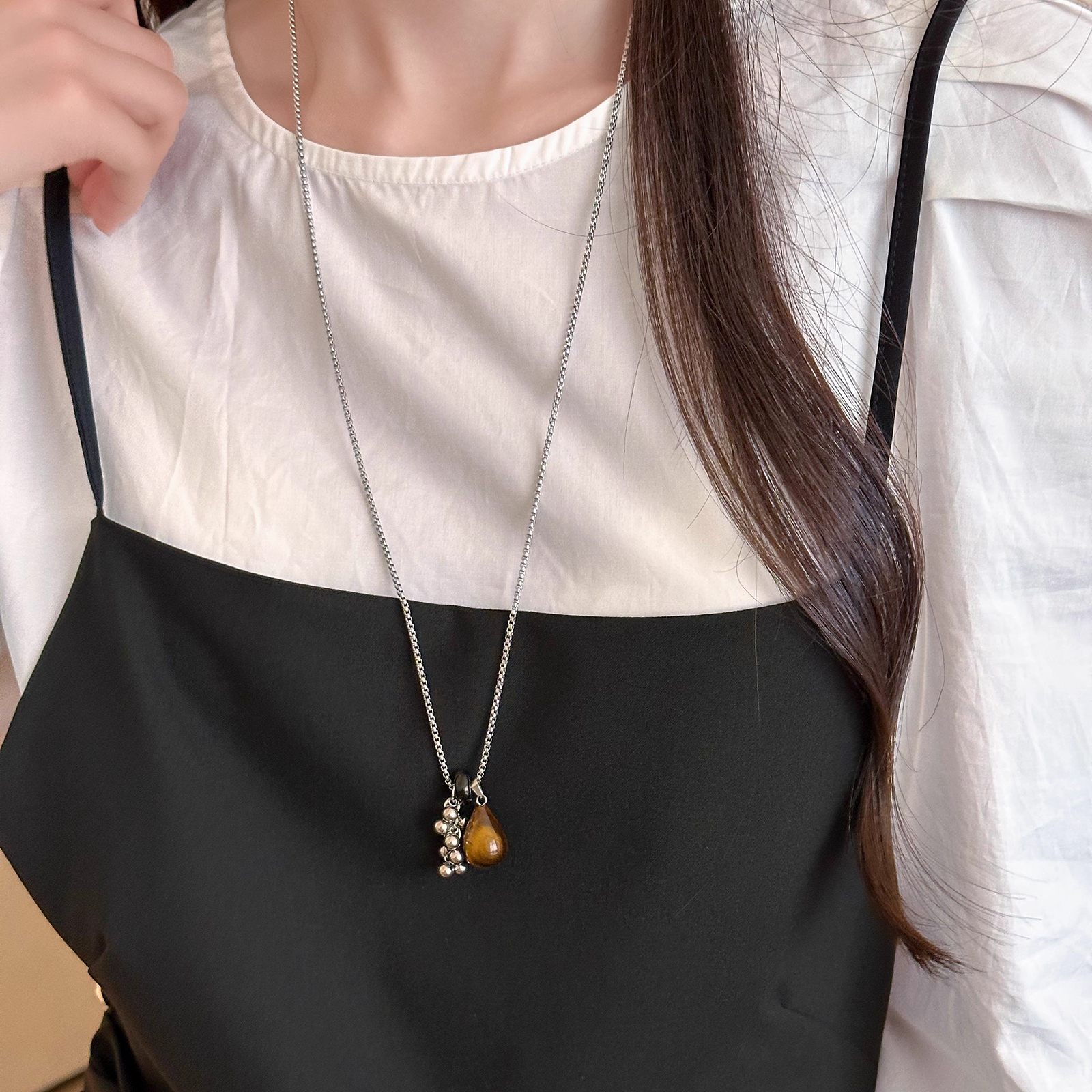 天然石轻奢项链女款2025新款高级感长款毛衣链钛钢小众配饰虎眼石