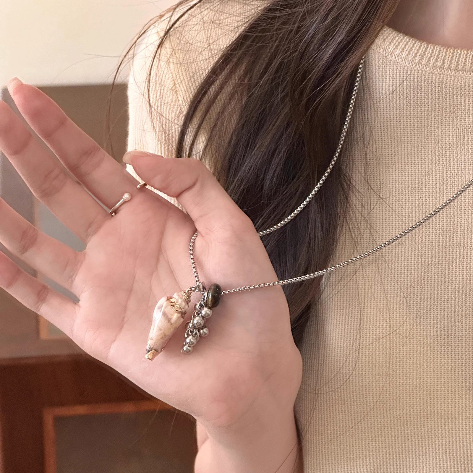 施家真多麻灰色珍珠项链颈链轻奢小众毛衣链配饰女款2025新款爆款