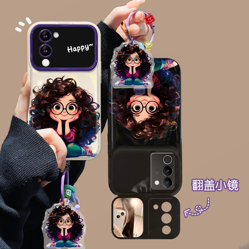 适用vivos17手机壳新女款x100/90高级感x80/70大视窗s16e翻盖镜子s15/10卷发女孩挂坠s9/7防摔硅胶iqoo保护套