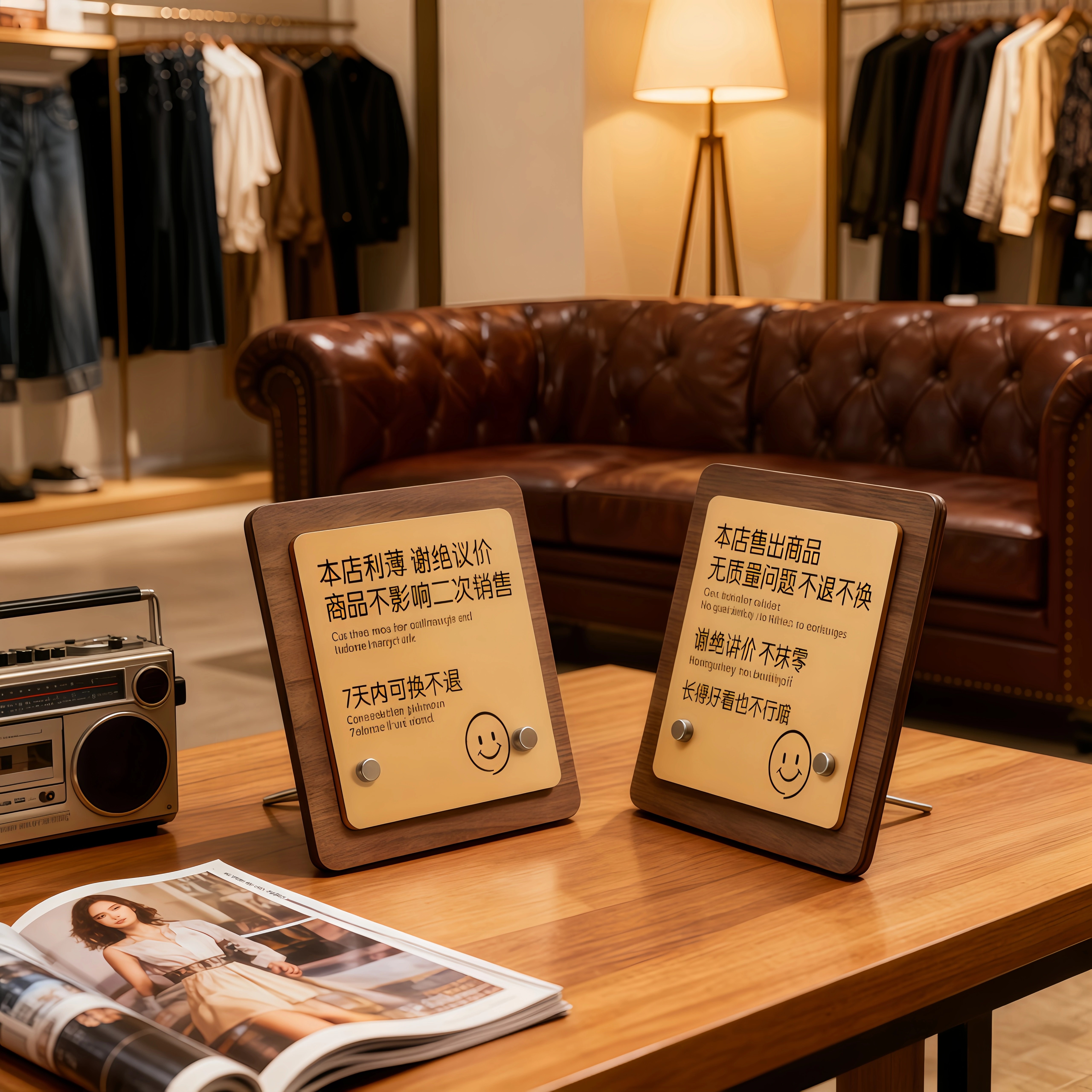概换提示牌本店售出商品日期内可换货谢绝还价不议价不抹零立式桌面立牌亚克力定制服装店谢绝还价立牌摆台牌