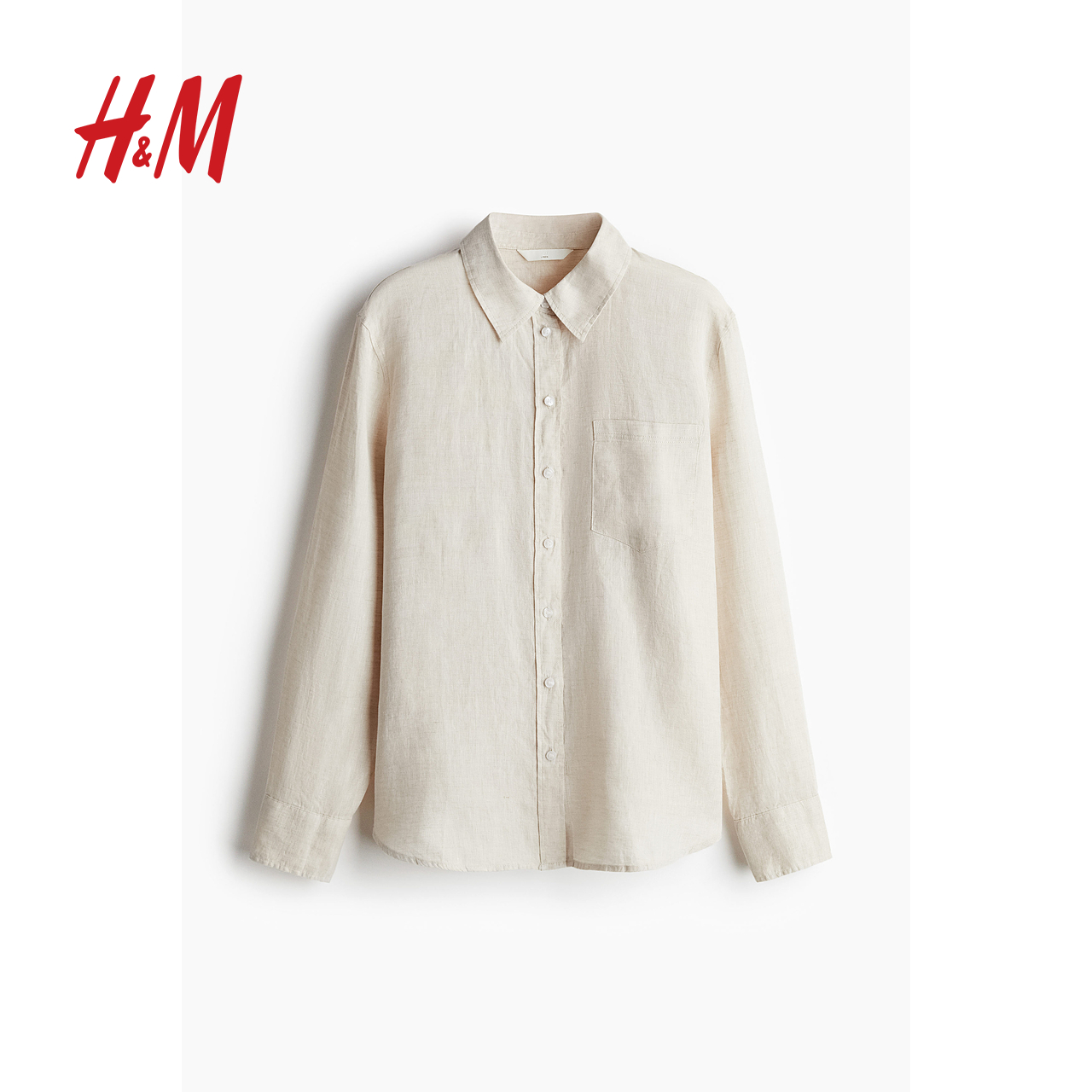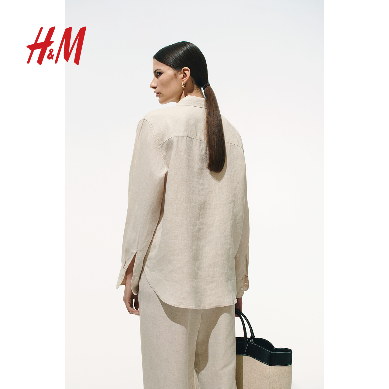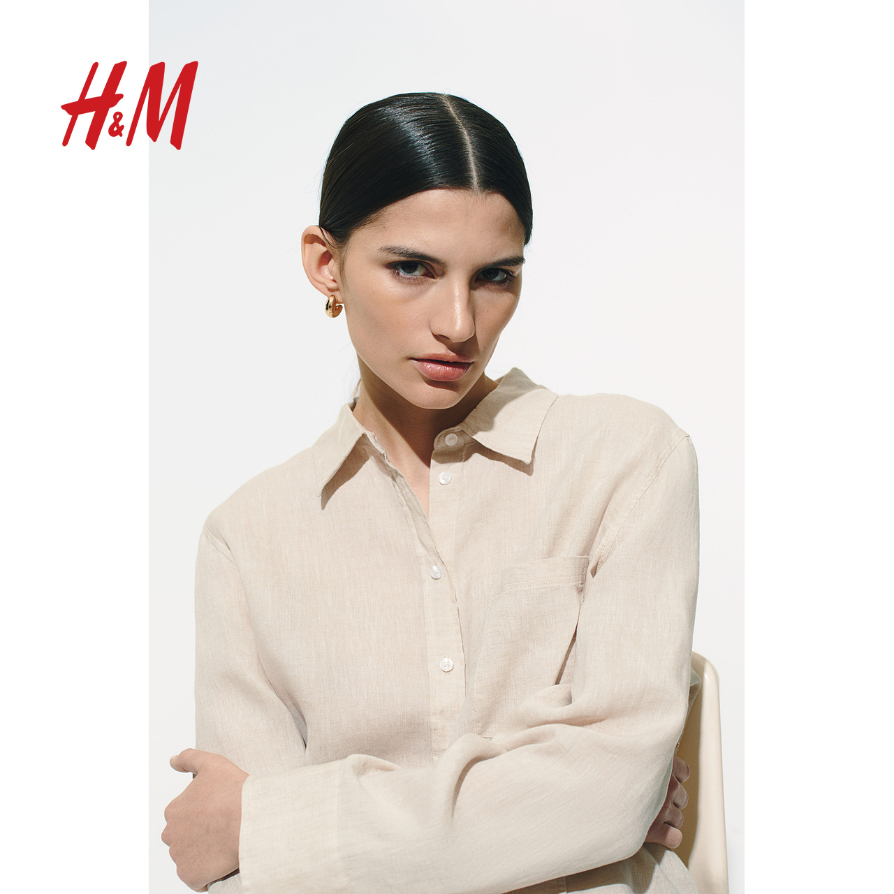 HM女装衬衫秋季新品时尚休闲透气松驰感亚麻衬衫有领上衣1219107