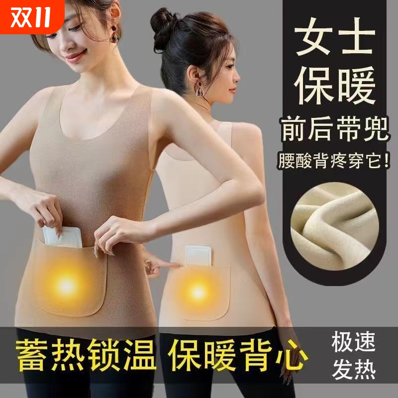 德绒保暖背心防寒女秋冬双兜加绒加厚内搭前后打底衫发热无痕上衣