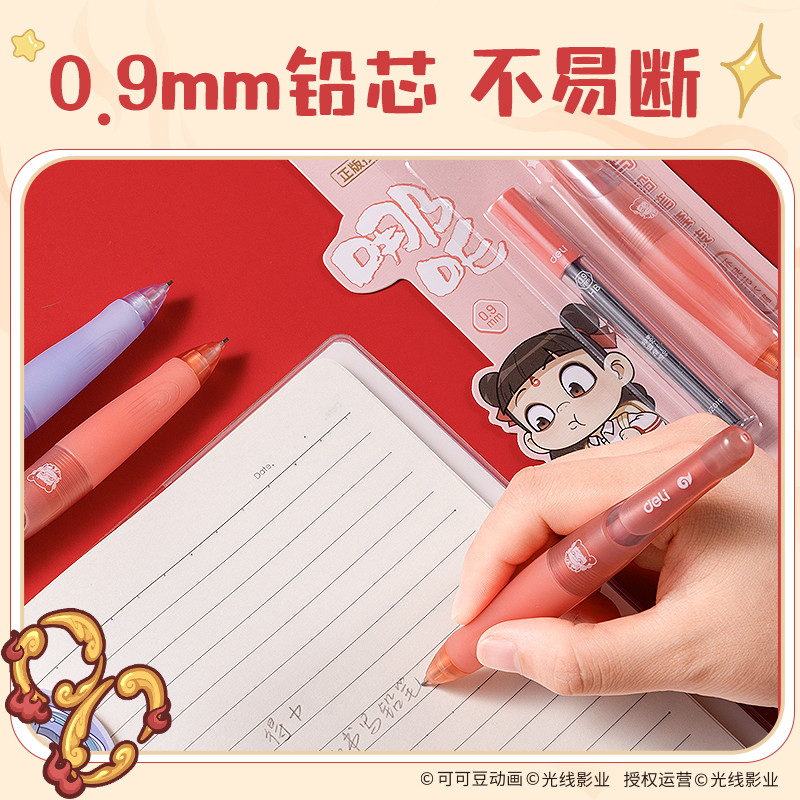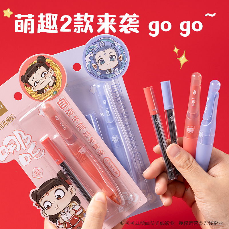 得力哪吒联名自动铅笔0.9矫姿活动铅笔小学生专用自动笔高颜值中国风国漫书写铅笔练字矫正握姿NZ016