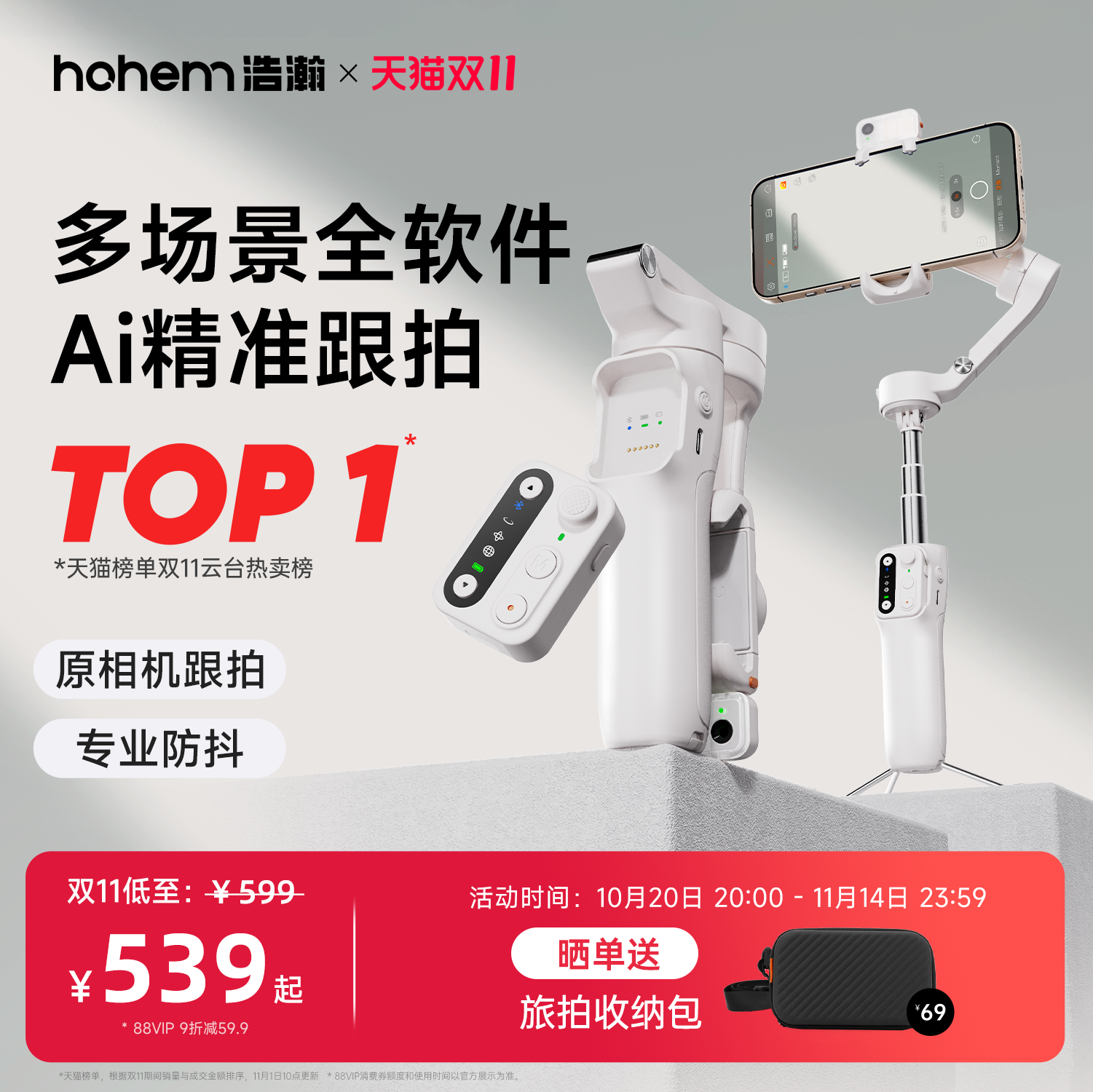 浩瀚V3 手机万向云台全自动智能跟拍稳定器Ai人脸识别自拍神器330度旋转视频直播支架自拍杆新款稳定期