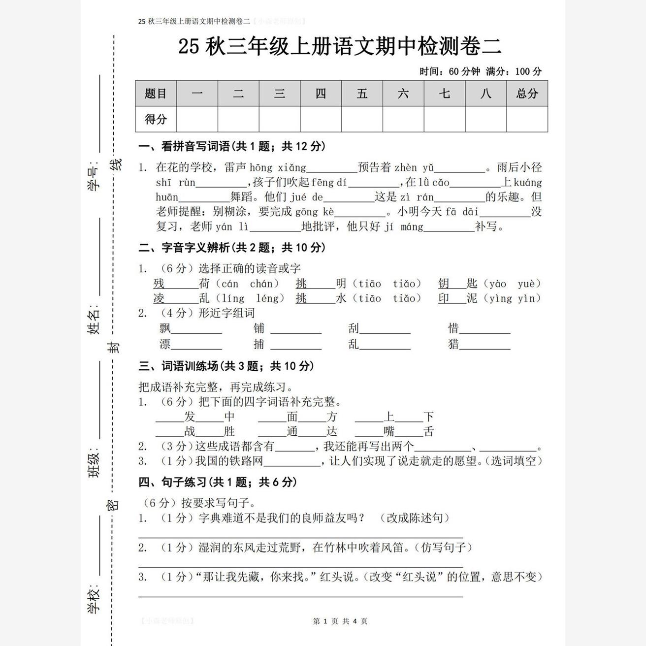 新25秋三上语数期中质量检测押题卷同步查漏补缺题型丰富